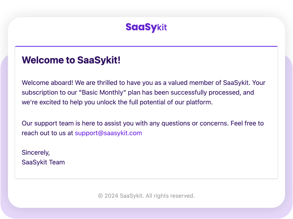 SaaSykit est livré avec un beau modèle d'email prêt à l'emploi qui prend en compte les couleurs de votre marque, ainsi que les emails typiques pour l'inscription des clients, la vérification, la réinitialisation du mot de passe, etc., configurés pour vous.