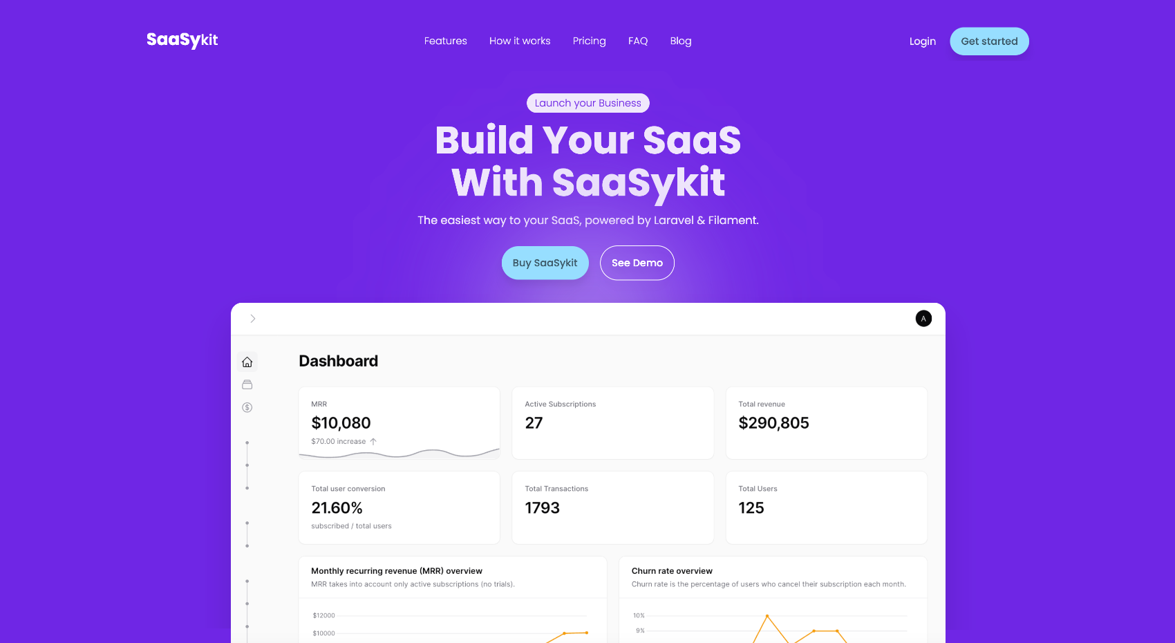 SaaSykit est construit sur Laravel Laravel, le framework PHP le plus populaire, et Filament , un panneau d'administration beau et puissant pour Laravel. Il utilise également TailwindCSS, AlpineJS, et Livewire.