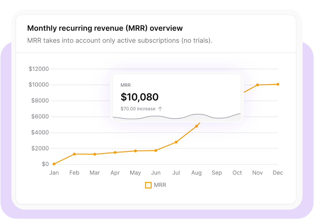 Visualisez votre MRR (revenu récurrent mensuel), taux de désabonnement, ARPU (revenu moyen par utilisateur) et d'autres métriques SaaS directement dans votre panneau d'administration.